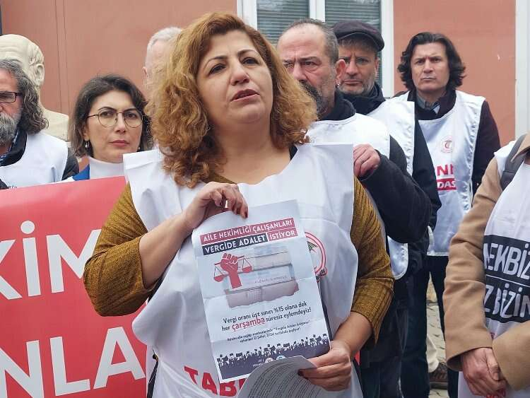TTB adına basın açıklamasını okuyan TTB Aile Hekimliği Kol Sekreteri Dr. Sibel Uyan, “Aile hekimlerinin performansa dayalı sözleşmeli çalışmak zorunda kaldığı, uygunsuz ve yetersiz binalarda bazen tek başına çalışıp koruyucu hekimlikten ziyade tedavi edici hekimliğin teşvik edildiği bir ortamda hizmet vermeye çalıştığını hatırlatmak istiyoruz. Aile hekimlerinin hem birinci basamak sağlık hizmetlerinin temel özellikleri ve toplum sağlığına olan katkıları bakımından hem de yaşadıkları ekonomik özlük hak kısıtlamaları, idari baskılar bakımından birçok sorun yaşadığını bildirmek istiyoruz. En son TBMM’de TTB’nin ve muhalif partilerin milletvekillerinin tüm itirazlarına rağmen sağlıkla ilgili bazı kanunlarda ve 663 Sayılı KHK de değişiklik yapılarak Anayasa Mahkemesi tarafından iptal edilen bazı düzenlemeler yeniden yasaya konulmuş, ASM çalışanlarına hem disiplin cezası hem de ek ödeme kesintisi getiren yasa komisyondadır. Tüm bu sorunların yanında ülkemizde yaşanan yüksek enflasyon karşısında yetersiz ücret artışı ve ücretlerden kesilen yüksek vergiler dayanılmaz hale gelmiştir. Deprem felaketi döneminde tüm güçleri ile görevinin başında olan sağlık çalışanları bu son beş yıl içinde giderek daha fazla gelir kaybına uğramıştır. Aile Hekimlerinin ücretleri parçalı hale getirilmiş, yıllar önce artırılacağı müjdesi verilen temel maaşımız yoksulluk sınırının altında kalmış, ilave ödeme, teşvik, destek, performans gibi kalemlerle emekliliğe yansımayan, sağlık hizmetine katkısı olmayan ödeme sistemi tercih edilmiştir. Tüm bu sağlıksız ortamın içinde Aile Hekimliği çalışanları dışında bu ek ödemeler vergiye dâhil edilmezken aile hekimliğinde ek bir vergi yükü olarak gelirimizin daha da düşmesine neden olmakta, 2023 Ocak ve 2023 Kasım aylarında elimize geçen ücretler karşılaştırıldığında arada yapılan ilave ödemelerin yok olduğu görünmektedir” dedi.