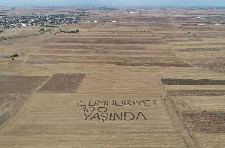 Erkorkmaz, tarlasına giden ikili traktörün pulluğu ile toprakta iz bırakarak "Cumhuriyet 100 yaşında" yazdı.
