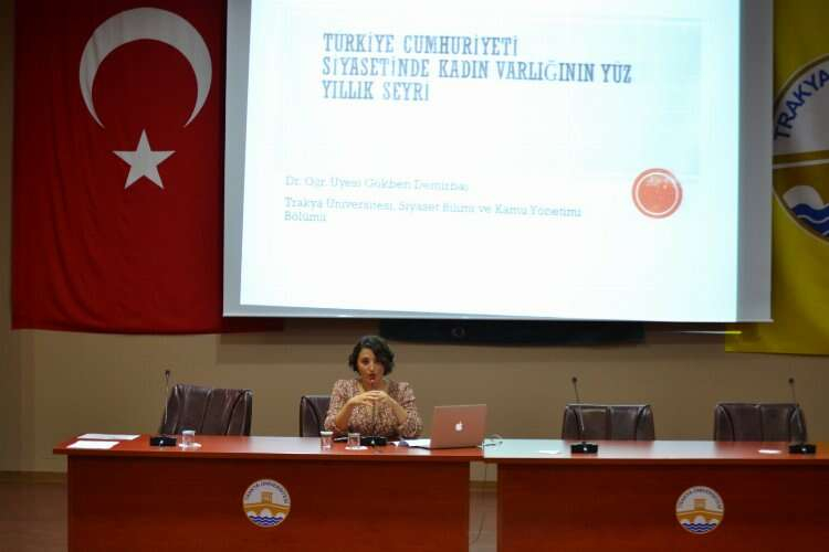 Trakya Üniversitesi Kadın ve Aile Çalışmaları Uygulama ve Araştırma Merkezi tarafından Türkiye Cumhuriyeti’nin 100’üncü yılı etkinlikleri kapsamında Türkiye Cumhuriyeti siyasetinde kadın varlığının 100 yıllık seyri konulu söyleşi düzenlendi.