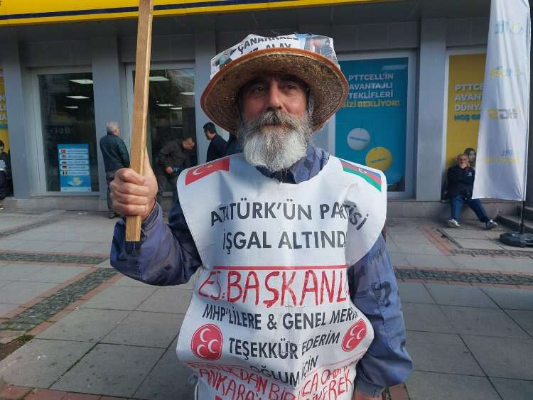 Sönmezer, “Benim adım Ahmet Sönmezer çok eski koyu bir CHP’liyim çok emek verdim. Üç yıl Adana il binasında çalıştım. Oğlum askerde hastalandı, sahip çıkmadılar. Bu 3 yıl çalıştığımda sigortamı da yapmadıkları için emekli olamadım. Girişim 1983 yaşım 58 prim borçlarımdan dolayı emekli olamadım. Her şeyi sineye çektim. Atatürk’ün partisi işgal altında dememin nedeni bu. Oğlum askerde hastalandı sahip çıkmadılar. Ankara GATA’ya götürdüm sahip çıkmadılar. Ben Çanakkale’de şehitliği gezerek geldim. Bu ülke bir bütündür. Bizim ülkemiz bir cennettir. Ülkemiz kolay kurulmadı, coğrafyamızın haritası masanın üzerinde çizilmedi, şehitlerimizin kanıyla çizildi. Oğlumdan Erzurum’da kan aldılar 3,5 aylık askerken pankreasında iltihap çıktı. Oğlumu askere sağlam gönderdim, çürük aldım. Bu benim 5’inci yürüyüşüm 6 bin 500 kilometre yol gittim. Habur Sınır Kapısı’ndan itibaren yürüyerek geliyorum. Buradan Ankara’ya gideceğim oyumu kullandıktan sonra CHP’nin önünde çadır kuracağım” dedi.