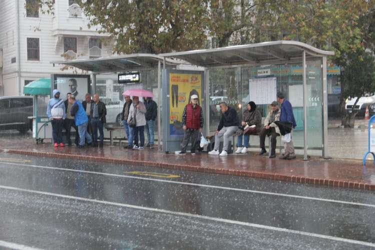Yağışa hazırlıksız yakalanan bazı vatandaşlar, otobüs duraklarında korundu.