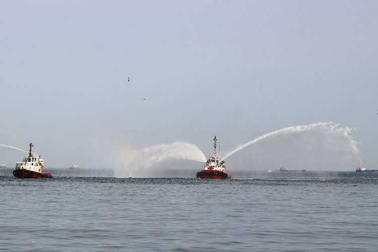 Römorkörlerin, yelkencilerin arkasından havaya su püskürtmesi ilgiyle izlendi.