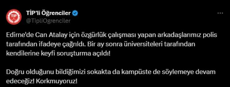 TİP İl Örgütü’nün yanı sıra konuyla ilgili TİP üyesi öğrencilerden oluşan “TİP’li Öğrenciler” de sosyal medya hesaplarından açıklama yayımladı. TİP’li Öğrenciler sosyal medya hesabından yapılan açıklamada; “Edirne'de Can Atalay için özgürlük çalışması yapan arkadaşlarımız polis tarafından ifadeye çağrıldı. Bir ay sonra üniversiteleri tarafından kendilerine keyfi soruşturma açıldı. Doğru olduğunu bildiğimizi sokakta da, kampüste de söylemeye devam edeceğiz, korkmuyoruz” ifadelerine yer verildi.