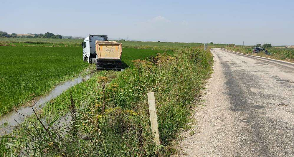 Kaza, Büyükdöllük köyü yolu üzerinde meydana geldi. Sürücüsünün direksiyon hakimiyetini kaybettiği TIR, yoldan çıkarak suyla kaplı çeltik tarlasına girerek çamura saplanıp durdu. Yolun dar olmasından dolayı kendisine yol vermeyen küçük araçlardan dolayı hakimiyetini kaybettiğini belirten TIR sürücüsü C.K, "Bu yolda haftada olmasa da 15 günde bir bu şekilde benim gibi bir arkadaş tarlaya uçuyor. Yolun dar olması bir yana küçük araçlar daha çok sıkıntılı, yol vermiyorlar. Yetkilerin bu yola bakmaları lazım" dedi.