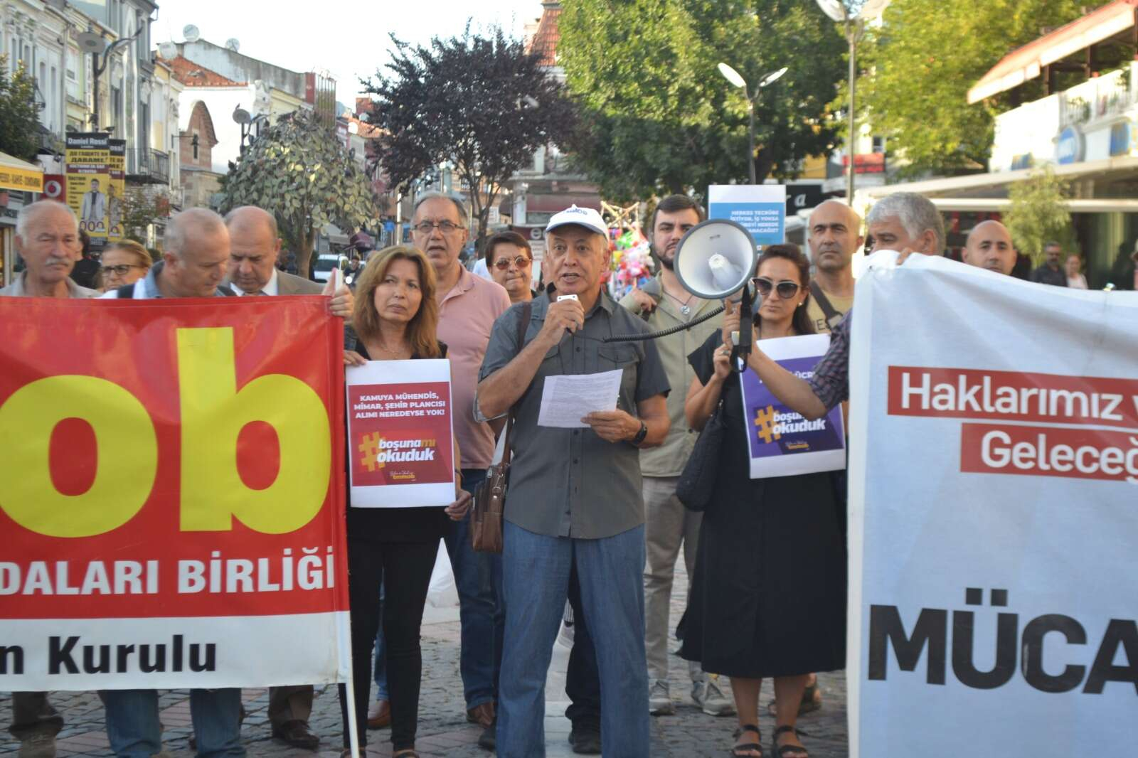 Dayanışma günü dolayısıyla TMMOB üyeleri Edirne Saraçlar Caddesi’nde bir basın açıklaması düzenledi. Dayanışma gününe, coşkulu kutlamalar yerine, yaşadıkları büyük sorunlarınlar damga vurduğu belirtilen basın açıklamasını, TMMOB Edirne İl Koordinasyon Kurulu Sekreteri Yılmaz Eren okudu. Eren “İçerisinde bulunduğumuz mesleki, ekonomik ve toplumsal koşullar bizlere ‘boşuna mı okuduk’ sorusunu sorduruyor. Sorunlarımız giderek büyüyor. Üzülerek görüyoruz ki, bugün geldiğimiz nokta hem bizler için hem halkımız için daha da zor koşullara davet çıkarıyor İşsizlik, hayat pahalılığı, düşük ücretler, güvencelik, özlük haklan ve örgütlenme sorunları ülkemizde çalışan mühendis, mimar ve şehir plancılarının hala en öncelikli sorunları olmaya devam ediyor. Kamusal yatırımların ortadan kalkması, rant hırsının bilim ve tekniğin önüne geçmesi, sermayenin ihtiyaçlarının halkın ihtiyaçlarının önünde tutulması nedeniyle mesleğimiz sistematik olarak değersizleştiriliyor. Bir dönemin en gözdesi olarak görülen mesleklerimiz, bugün diplomalı işsizliğin güvencesi bir geleceğin, açlık ve yoksulluk sinin altında ücretlerle çalışmanın sembolü haline getiriliyor. Hem insanlık hem meslek onurumuzu ayaklar altına alınıyor” dedi.