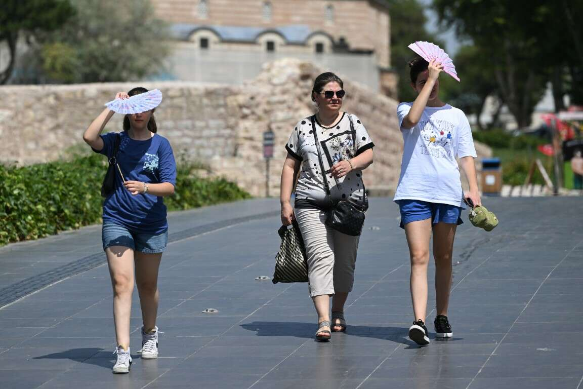 Bazı kişiler şemsiyeler yardımıyla sıcaktan korunmaya çalışırken, bazıları da yelpaze yardımıyla serinliyor.