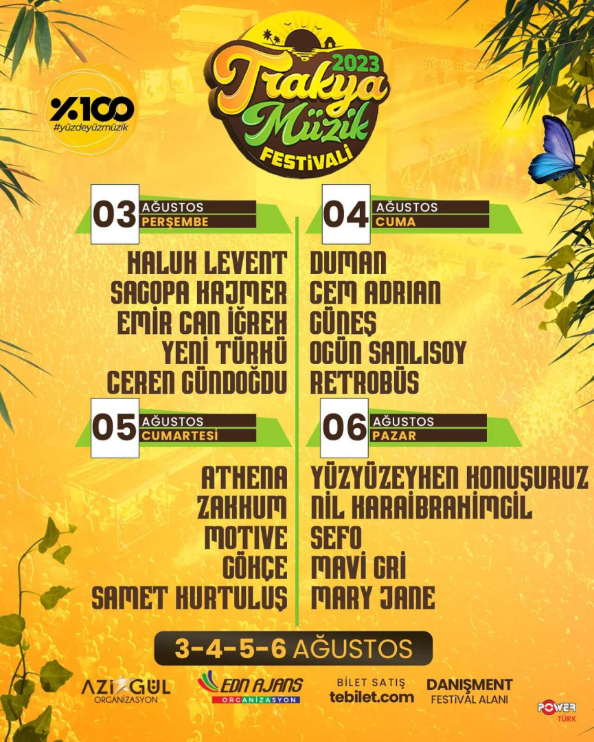 Edirne’nin Keşan ilçesinde Danişment sahilinde her yıl EDN Organizasyon ve Aziz Gül Organizasyon iştirakleri ile Trakya Organizasyon tarafından düzenlenen Trakya Müzik Festivali’nin kadrosu açıklandı. Saros Körfezi’nde 3-6 Ağustos tarihleri arasında düzenlenecek festivalde çok sayıda müzik grubu ve sanatçılar sahne alacak.