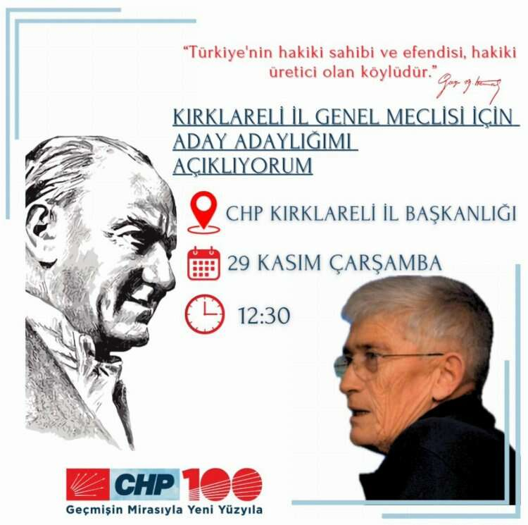 Doğa ve Kültür (DOKU) Derneği Yönetim Kurulu Başkanı ve Trakya Platformu Kırklareli Sözcüsü Göksal Çidem, Cumhuriyet Halk Partisi’nden (CHP) Kırklareli İl Genel Meclisi Üyeliği için aday adaylığı başvurusunu yaptı.
