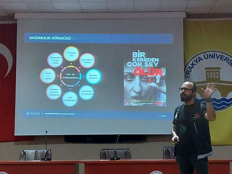 Trakya Üniversitesi (TÜ) İktisadi ve İdari Bilimler Fakültesi Prof. Dr. Fehmi Yıldız Konferans Salonu’nda Bağımlılıkla Mücadele Söyleşisi gerçekleştirildi. Emniyet Genel Müdürlüğü Narkotik Şube Müdürlüğü personeli Narko Rehber - Narkolog Hakan Yılmaz, TÜ öğrencilerine narkotik suçlarla mücadelenin önemi, madde bağımlılığı, kullanımı ve etkileri, narkotik maddeler, uyuşturucu satılan yerler ile kullanılan mekanlar, uyuşturucu suçlarında yasal durum, Uyuma uygulamasının tanıtılması, Madde kullanımı ve bağımlılığı ile mücadele merkezlerini konu alan bir sunum gerçekleştirildi. Sunumda uyuşturucu maddenin kullanım aşamalarını ve bağımlılığı anlatan bir animasyon gösterimi, daha sonra da İki Ekmek isimli kısa film gösterimi yapıldı. Son olarak soru cevap ile program sona erdi.