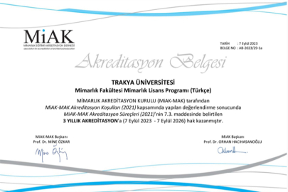 Trakya Üniversitesi akredite birimleri arasına bir yenisi daha eklendi. Uluslararası eğitim kalitesinin ve akredite olan birimlerin her geçen gün arttığı Trakya Üniversitesinde Mimarlık Fakültesi Mimarlık Bölümü, Mimarlık Akreditasyon Kurulu (MİAK-MAK) tarafından 3 yıllığına akredite edildi.
