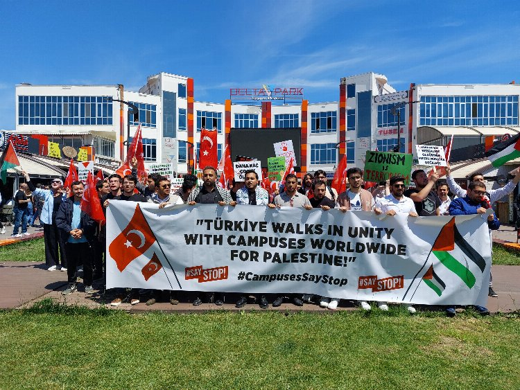 Çam, "Artık tepki işgalcilerin hiç tahmin edemeyeceği bir yerden yükseliyor. En güvendikleri yer olan Amerika Birleşik Devletleri'nin (ABD) kalbi üniversitelerden gelen sesler işgalcilerin sistemlerini alt üst ediyor. Dünyanın dört bir yanından gelen makul çağrıları ses yalıtımlı odalarından duymayanlar, artık kelimenin tam anlamıyla çaresiz şekilde sonlarının yaklaştığını görüyor ve kontrollerini her geçen gün biraz daha kaybediyorlar. Arizona'da Florida'da, Ohio'da, Texas'ta, Kaliforniya'da yıllardır sırtlarını dayadıkları tüm üniversiteler artık onlar için tehlikeden ibaret. İşkencelerine, soykırımlarına gelen yankılar, bağırmalar onlar için bir takım cezalandırılması gereken davranışlar. Çünkü yaptıklarının haksız olduğunu, hukuka ve vicdana aykırı olduğunu en iyi onlar biliyorlar. Bununla mücadele etmek içinde onurlu bir şekilde kendilerine direnen bilim insanlarını ve öğrencileri tutuklama yolunu tercih ediyorlar. Biz de bugün buradan haykırıyoruz. Onlar sanıyorlar ki, biz sussak mesele kalmayacak. Halbuki, biz sussak, tarih susmayacak. Tarih sussa, hakikat susmayacak. Bizlerde, vicdan sahibi her bir genç gibi ÜniAK olarak Gazze’de yaşanan katliama karşı on binlerce gencin katılımıyla ilk günden bugüne kadar gerçekleştirdiğimiz Say Stop eylemlerimize, boykot çağrılarımıza ve yardım faaliyetlerimize ara vermeksizin devam edeceğimizi ve Gazze halkının çığlığına ses veren herkesin farklılıklarına bakmaksızın yanında olmaya devam edeceğimizi bildiriyoruz. Edirne ÜniAK teşkilatları ve Trakya Üniversitesi öğrencileri olarak Gazzelilerin çığlıklarına kulak veren ABD'nin Kaliforniya Üniversitesi öğrencilerinin yanında olduğumuzu belirtiyor. 81 ilimizde bulunan bütün üniversiteli kardeşlerimizi ve akademisyenlerimizi İsrail barbarlığına karşı durmaya, Gazzeli kardeşlerimizin yanında olmaya ve Say Stop eylemlerimize ses vermeye davet ediyoruz" ifadelerine yer verdi.