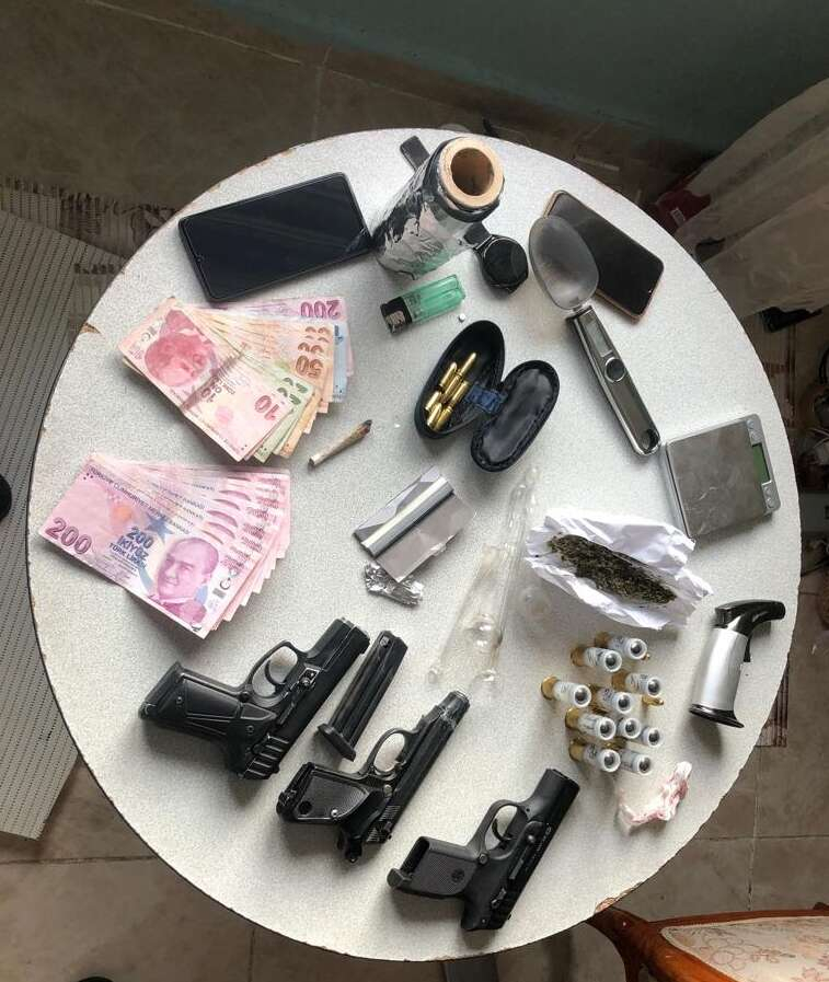 Adreslerde 2,42 gram sentetik uyuşturucu, 28,35 gram esrar, 8 tabanca, 2 av tüfeği, 90 tabanca fişeği, 3 hassas terazi, 3 bıçak, 2 makas ile uyuşturucu satışından elde edildiği değerlendirilen 3 bin 30 lira ele geçirildi.