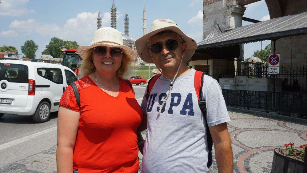 Antalya'dan Edirne'ye gezmeye gelen Cemal ve Eylem Ünal çifti; şemsiye, gözlük, şapka, güneş kremi ve su ile sıcaktan korunmaya çalıştıklarını söyledi.