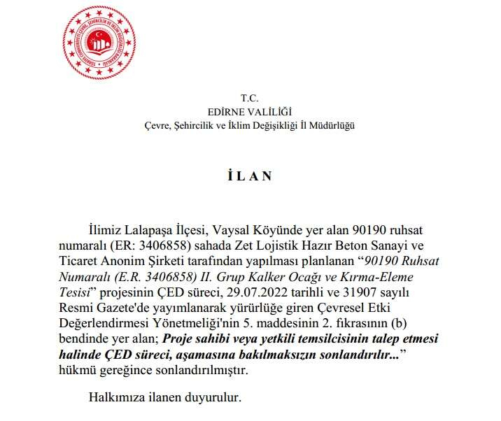 Edirne Çevre, Şehircilik ve İklim Değişikliği İl Müdürlüğü, konuyla ilgili yaptığı açıklamada; “İlimiz Lalapaşa İlçesi, Vaysal Köyünde yer alan 90190 ruhsat numaralı (ER: 3406858) sahada Zet Lojistik Hazır Beton Sanayi ve Ticaret Anonim Şirketi tarafından yapılması planlanan ‘90190 Ruhsat Numaralı (E.R. 3406858) II. Grup Kalker Ocağı ve Kırma-Eleme Tesisi’ projesinin ÇED süreci, 29.07.2022 tarihli ve 31907 sayılı Resmi Gazete'de yayımlanarak yürürlüğe giren Çevresel Etki Değerlendirmesi Yönetmeliği'nin 5. maddesinin 2. fıkrasının (b) bendinde yer alan; ‘Proje sahibi veya yetkili temsilcisinin talep etmesi halinde ÇED süreci, aşamasına bakılmaksızın sonlandırılır’ hükmü gereğince sonlandırılmıştır” ifadeleri kullanıldı.