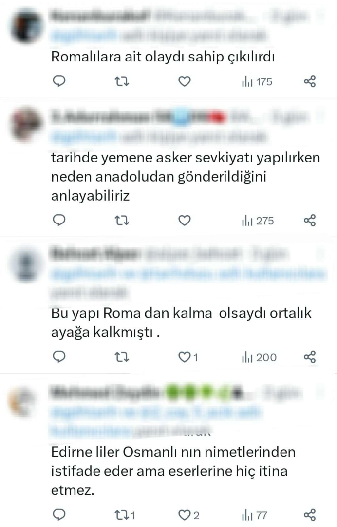 Sosyal medyada bazı kullanıcılar paylaşılan videonun altına: “Çok yazık, sadece burası değil. Kral Kızı Bazilikası, Osmanlı Sahil Kervanı ve Enez Kalesi’nin de aynı durumda olduğuna, umarım en kısa sürede el atılır, Romalılar olsa sahip çıkardı, Edirneliler Osmanlı’nın nimetlerinden istifade eder ama eserlerine hiç itina etmez” şeklinde ifadelere yer verildi.