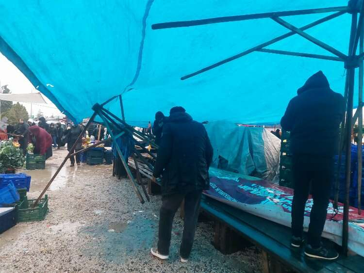 Yağışlı havada tezgahlarını açmaya çalışan esnaflar ise rüzgâr, yağış ve soğuk hava ile mücadele etti. Zaman zaman rüzgâra dayanamayan şemsiyeler ise devrilerek tehlike oluşturdu.