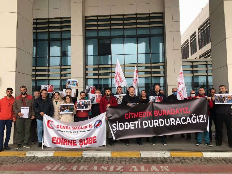 Trakya Üniversitesi Hastanesi’nde yaşanan sağlıkçılara yönelik şiddet, Genel Sağlık – İş Sendikası’nın Edirne Sultan 1. Murat Devlet Hastanesi önünde düzenlediği bir eylemle protesto edildi. Sağlık çalışanları açıklamalarında yaşamak ve yaşatmak istediklerini vurguladılar.
