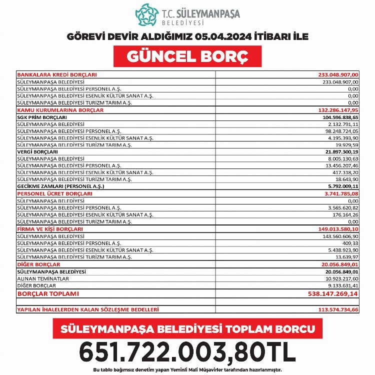 Süleymanpaşa Belediyesi Tarihi Belediye Binası'na pankart asarak kalem kalem tüm borçları açıklayan Volkan Nallar, hazırlanan tablonun bağımsız denetim yapan yeminli mali müşavirler tarafından yapıldığının altını çizdi.