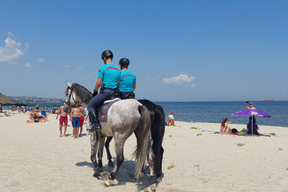 Sahilde denize giren vatandaşlarda jandarma atlı timine yoğun ilgi göstererek devriye atan atlarla bol bol fotoğraf çekilmeye çalıştı.