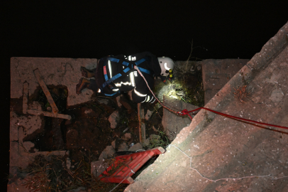 Köprü ayağına inen itfaiye eri tarafından sıkıştığı taşın altından çıkarılan yavru kedi, fileyle yukarı çekilerek kurtarıldı.