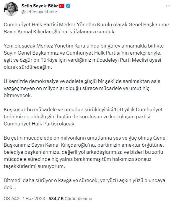 CHP Parti Meclisi Üyesi Selin Sayek Böke yaptığı sosyal medya paylaşımında “Cumhuriyet Halk Partisi Merkez Yönetim Kurulu olarak Genel Başkanımız Sayın Kemal Kılıçdaroğlu’na istifalarımızı sunduk.” İfadelerini kullandı.