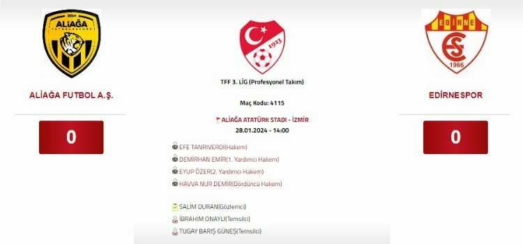 TFF 3. Lig A Grubu’nda mücadele eden Edirnespor, 17’nci hafta maçında Aliağa Futbol A.Ş. ile Aliağa Atatürk Stadı’nda karşılaştı. İzmir’de bugün 14.00’te başlayan karşılaşmayı hakem Efe Tanrıverdi yönetti. Tanrıverdi’nin yardımcılıklarını Demirhan Emir, Eyüp Özer ve Havva Nur Demir yaptı.