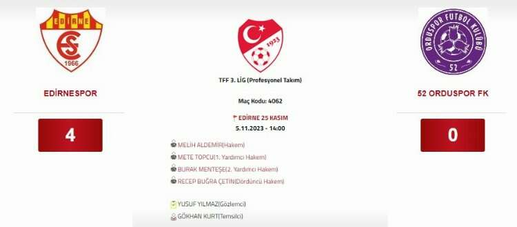 TFF 3. Lig A Grubu’nda mücadele eden Edirnespor, 9’uncu hafta karşılaşmasında 52 Orduspor FK’yi evinde ağırladı. 25 Kasım Stadı’nda bugün 14.00 başlayan karşılaşmayı hakem Melih Aldemir yönetti. Aldemir’in yardımcılıklarını Mete Topçu, Burak Menteşe ve Recep Buğra Çetin yaptı.