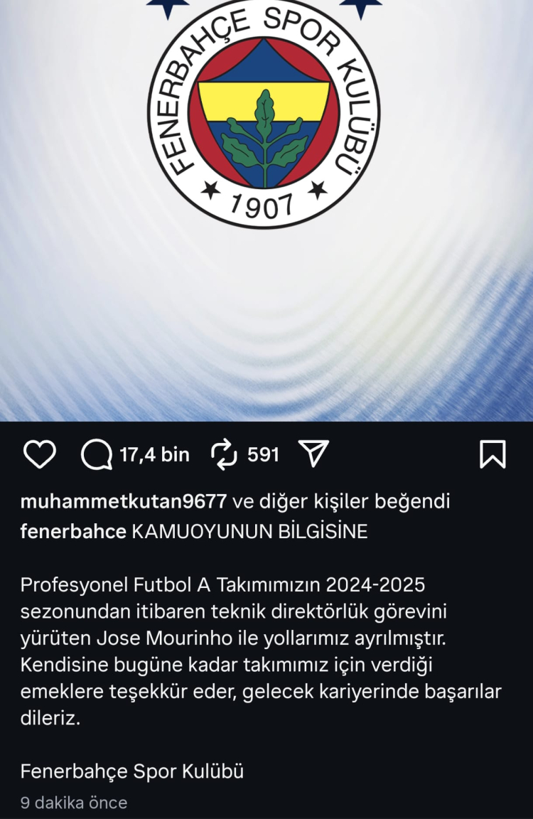 Kulüpten yapılan açıklamada, Mourinho’ya bugüne kadar takım için verdiği emekler için teşekkür edilirken, gelecek kariyerinde başarılar dilendi.
