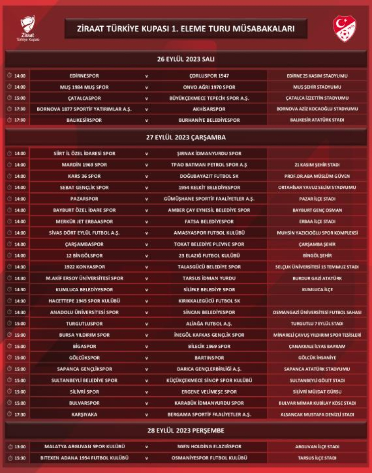 TFF Genel Sekreter Yardımcısı Özcan Şepik, Lig Yönetimi Direktörü Besim Yalçın ve Profesyonel Maç Planlama Müdürü Serkan Karasakaloğlu'nun katılımıyla düzenlenen kura çekimi neticesinde eşleşmeler belirlendi. 10-11-12 Eylül tarihlerinde oynanacak müsabakaların programı daha sonra ilan edilecek.