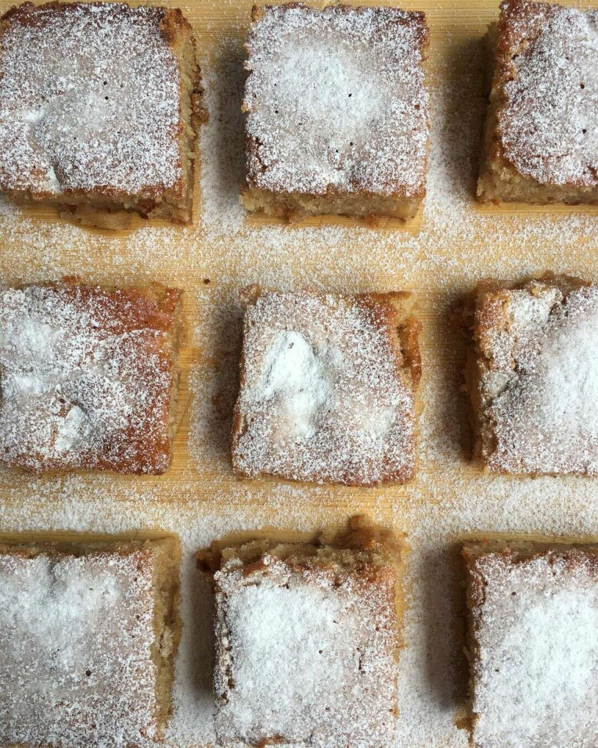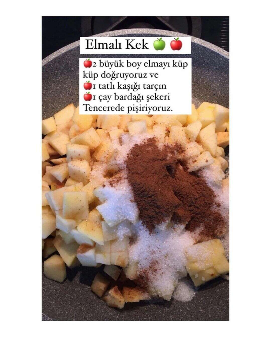 İlk önce elmayı küp şeklinde doğrayalım ve bir tavaya alalım. Üzerine şeker ve tarçını ilave edip pişirelim. Şeker karamelize haline gelince ve elmalar yumuşayınca ocaktan alalım. Yumurta ve şekeri köpük haline gelene kadar iyice çırpalım. Daha sonra yağ, yoğurt, şeker, vanilya, karbartma tozu, un ve elma harcını içine katıp spatula yardımı ile dıştan içe doğru karıştıralım. Bir borcama alıp ilk önce ısınmış fırında kek kabarana kadar 130 derecede pişirelim daha sonra 170 alıp pişirmeye devam edelim. Piştikten sonra ılıtalım ve kare parçalara ayırıp üzerine pudra şekeri dökelim.